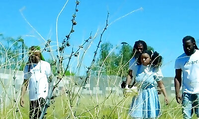 Perverted dark haired with pigtails is torn up and pissed in the filed