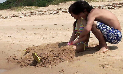 Japanese girl doggystyled at the beach